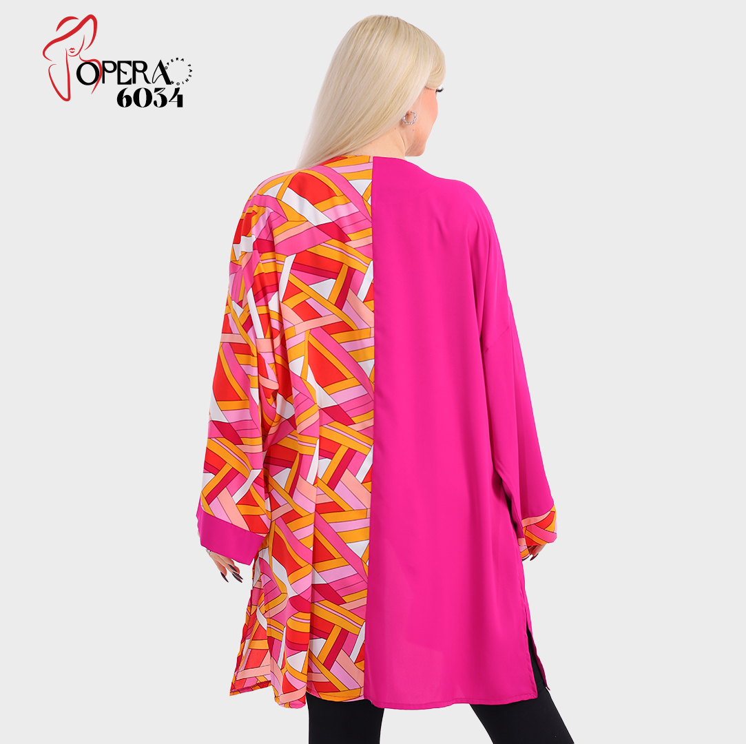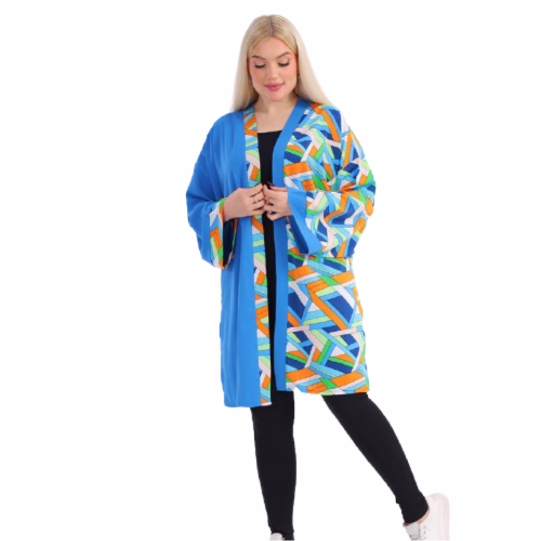 Printed and plain cardigan – made of SPHT fabric – the right side of the front panel is printed, matching the right side of the back panel – kimono-style sleeves with a plain cuff and a printed hemline – the left side of the front panel is printed, matching the left side of the back panel – printed sleeves with a plain cuff and a plain hemline – side slits – garment length: 100 cm