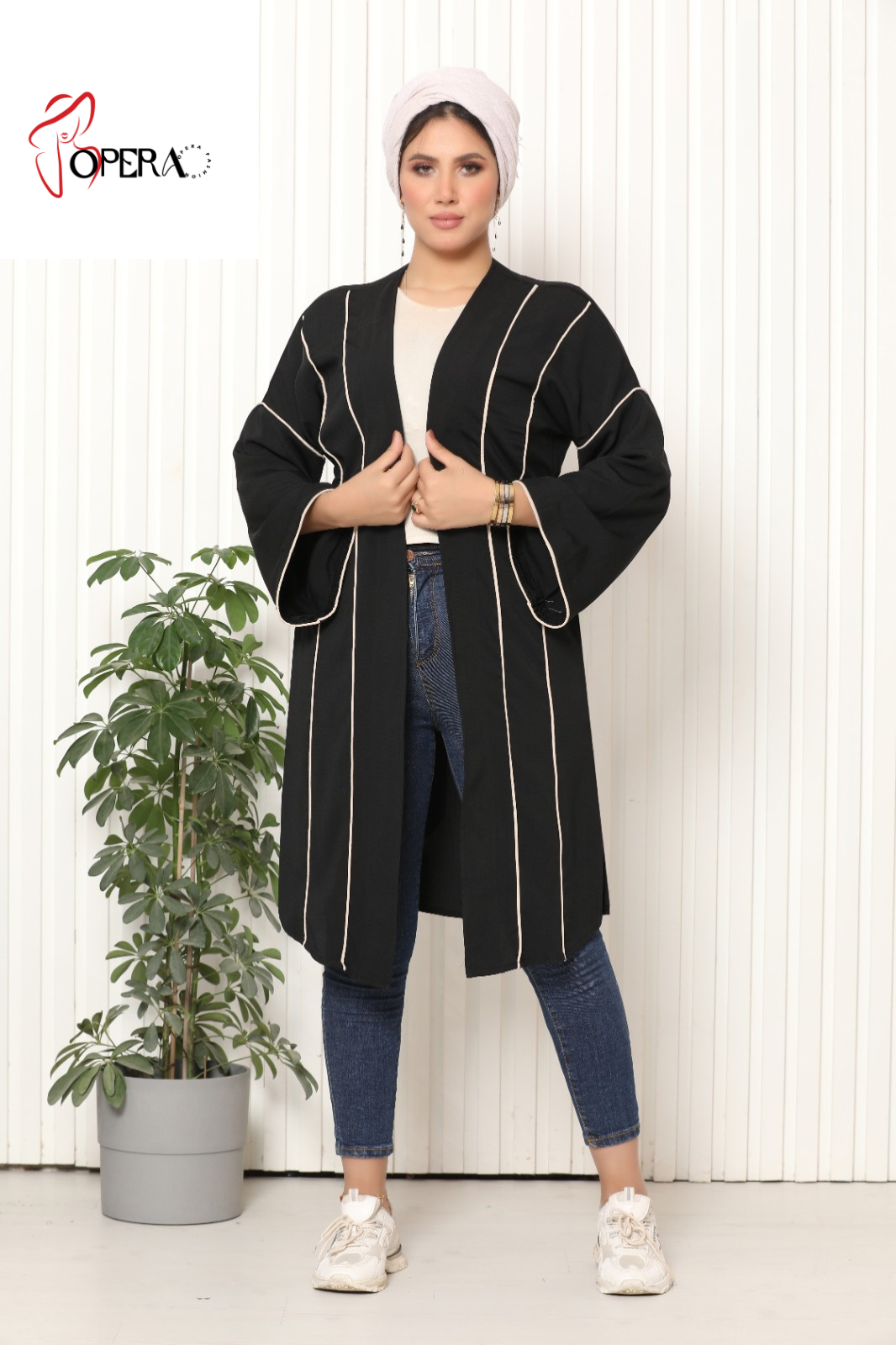 كارديجان  قصات فى الصدر والكم  بشرايط بية – الامام  اللون  الموديل الاسود شريط مطعم بخامة اس بى اتش لون بيج –  واللون الموديل لبنى -كيوى مطعم بشريط لون اسود – الخلف قطعة واحدة بدون قصات -بفتحة جانبية – طول القطعة 110 سم